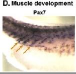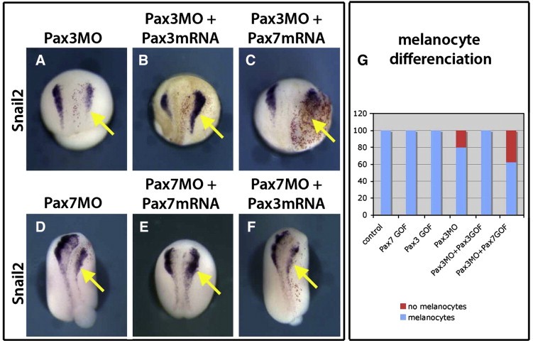 Fig. 10. Pax3 and Pax7 do not display redundant functions in neural crest induction and development. Pax3 morphant phenotype (A) is rescued by gain of function for Pax3 (B) but not Pax7 (C). At a later stage, Pax7 does not restore melanocyte development in Pax3 morphants either (G). Conversely, Pax3 is not sufficient to rescue Pax7 depletion (D, F), in contrast to Pax7 gain of function (E). These data indicate that the two proteins do not display similar roles in neural crest induction and development. Injected side is on the right (yellow arrow).