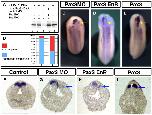 Supp. Fig 3. Pharmacological inhibition of FGF signaling at mid-neurulation does not affect pax7 patterning. Control embryos were grown in DMSO (carrier) from stage 12 to stages 18â22, they exhibit normal sox2, hoxb9 and pax7 expression (100% of the embryos). In contrast, sibling embryos grown in SU5402 between stages 12 and 18â22 have severe defects in neural patterning (hoxb9) while sox2 is normal. In this condition, pax7 expression remains largely comparable to controls (60% of the embryos).