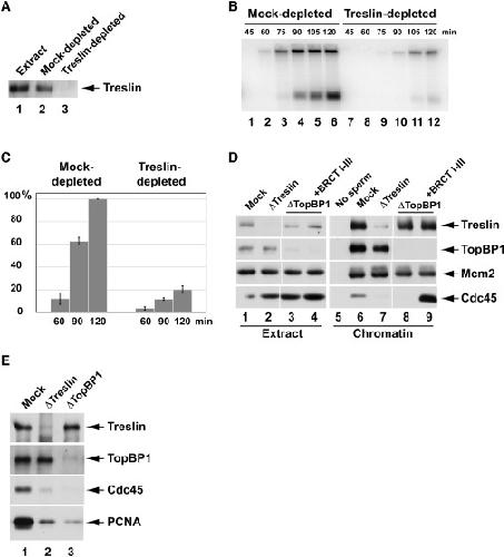 Figure 3. Treslin Is Required for Chromosomal DNA Replication in Xenopus Egg Extracts (A) Egg extracts (lane 1) were mock depleted with control antibodies (lane 2) or immunodepleted with anti-Treslin antibodies (lane 3) and immunoblotted for Treslin. (B) Mock-depleted (lanes 1â6) and Treslin-depleted (lanes 7â12) extracts were assayed for chromosomal DNA replication at the indicated times. (C) Compilation of results (mean ± standard deviation) from four independent experiments on the extent of replication in mock-depleted (left) and Treslin-depleted (right) extracts at the indicated times. Replication at 120 min in mock-depleted extracts is denoted as 100%. (D) Mock-depleted extracts (lanes 1, 5, and 6), Treslin-depleted extracts (lanes 2 and 7), TopBP1-depleted extracts (lanes 3 and 8), and TopBP1-depleted extracts supplemented with HF-TopBP1(I-III) (lanes 4 and 9) were incubated for 90 min in the absence (lane 5) or presence (lanes 6â9) of sperm nuclei. Extracts (lanes 1â4) and chromatin fractions (lanes 5â9) were immunoblotted for the indicated proteins. (E) Chromatin fractions from mock-depleted (lane 1), Treslin-depleted (lane 2), and TopBP1-depleted (lane 3) extracts were immunoblotted for the indicated proteins. See also Figure S2. |