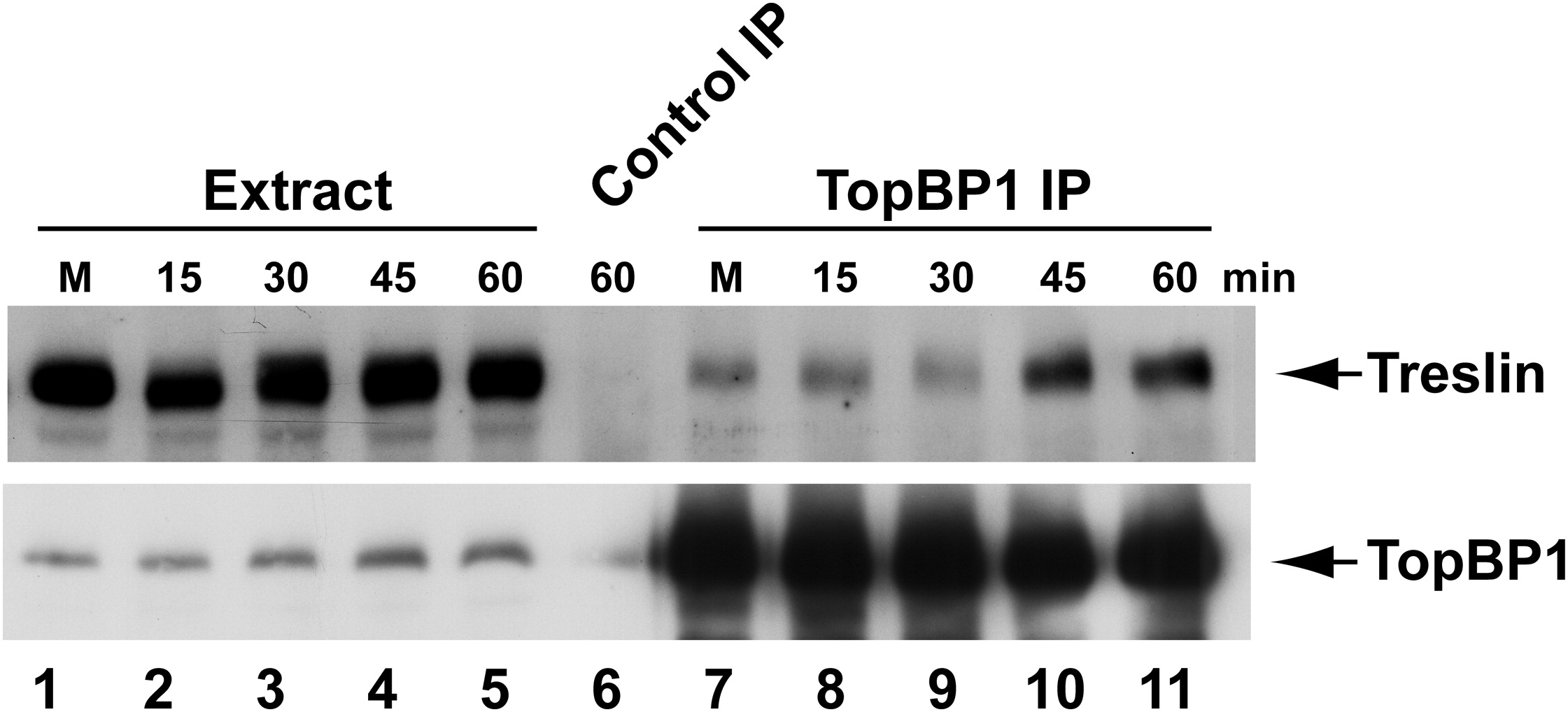 Treslin collaborates with TopBP1 in triggering the initiation of DNA replication.
