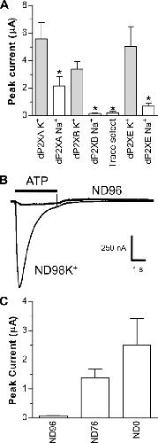 FIGURE 1. dP2X receptors are inhibited by Na+. Two-electrode voltage clamp recordings at a holding membrane potential of −70 mV were made from Xenopus oocytes expressing dP2X receptors. A, comparison of peak current amplitudes recorded in response to 3 mm ATP in extracellular recording solutions consisting either of ND96 (Na+ based) or ND98K+ (K+ based) with both solutions at pH 6.2. Note inhibition of currents by Na+ particularly for dP2XB and dP2XE channels. “Trace select” denotes ND96 extracellular recording solution made with ultrapure NaCl (Fluka 38979) for dP2XB. *, significant difference, p < 0.05, compared with respective ND98K+ current (n = 7). B, direct comparison of current amplitudes in ND96 and ND98K+ extracellular recording solutions (both pH 6.2) in the same dP2XB-expressing oocyte. Application of ATP (3 mm indicated by the bar) in ND96 was followed 5 min later by ATP application in ND98K+. C, mean current amplitudes in dP2XB-expressing oocytes after substitution of Na+ in ND96 with NH4+. ND76 denotes ND96 with 20 mm NH4Cl substituting for 20 mm NaCl. ND0 denotes solution with zero Na+ and 96 mm NH4Cl (n = 7).