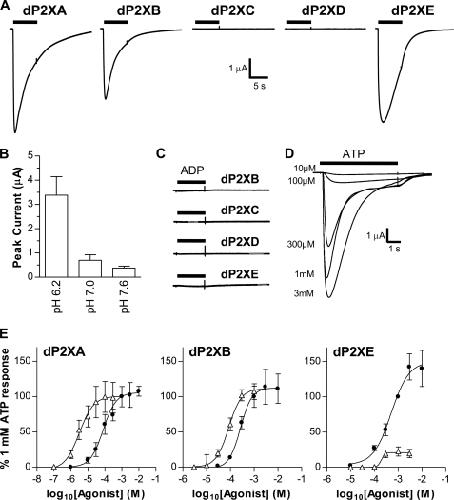 FIGURE 2. ATP-evoked currents in dP2X receptors. Two-electrode voltage clamp recordings from Xenopus oocytes expressing dP2X receptors. Agonist applications are indicated by bars. A, example membrane currents in dP2X-expressing oocytes recorded in response to 3 mm ATP. Extracellular recording solution was ND98K+. ATP resulted in inward currents that decayed during the continued presence of agonist in dP2XA, dP2XB, and dP2XE receptors. No currents were detected for dP2XC- and dP2XD-expressing oocytes. B, effect of pH on dP2XB currents recorded in ND98K+ (n = 5). C, dP2XB, -C, -D, and -E receptors are unresponsive to ADP (tested at 3 mm). D, example concentration-dependent currents for ATP in a dP2XE-expressing oocyte (application were 5 min apart). E, concentration response curves for ATP (black circles) and β,γ-imido-ATP (white triangles) in dP2XA-, dP2XB-, and dP2XE-expressing oocytes. Mean currents (±S.E.) were normalized to the response given by 1 mm ATP (n = 7 oocytes for dP2XE and 10–15 oocytes per data point for dP2XA and dP2XB).