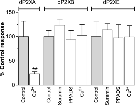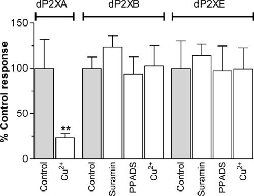 FIGURE 3. dP2XB and dP2XE receptors are not inhibited by copper, suramin, or PPADS. Peak current responses for each receptor were normalized to the mean of the control response to 3 mm ATP with no inhibitor present (n = 6–10 oocytes for each data point). CuCl2 (100 nm), suramin (100 μm), or PPADS (100 μm) were present in both the bath solution (5-min incubation prior to agonist application) and the 3 mm ATP solution. Unlike dP2XA (5) (**, p < 0.01), dP2XB and dP2XE are not inhibited by nanomolar concentrations of copper, and neither receptor is sensitive to the common P2 receptor antagonists PPADS and suramin.