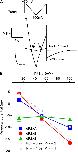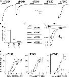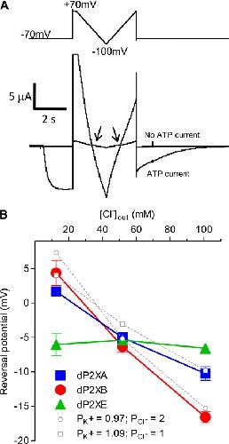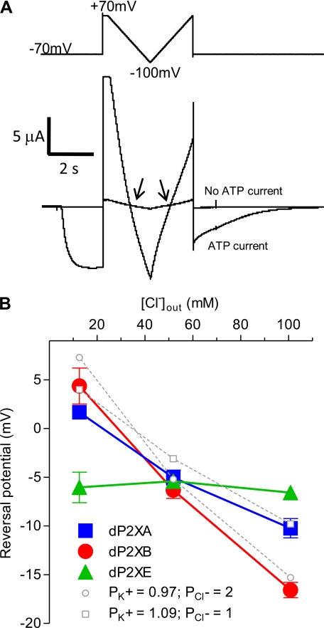 FIGURE 4. dP2XA and dP2XB are permeable to chloride ions. Reversal potentials were determined in external solutions with differing [Cl−] by substitution of KCl with potassium gluconate so as to keep [K+] constant while lowering [Cl−]. A, examples of current traces for dP2XB in 98 mm KCl. The reversal potential was taken as the mean value of the two crossover points (arrows) between the current in the absence of ATP and the current in the presence of ATP (3 mm). The voltage ramp protocol is indicated above the current trace. B, plot of reversal potential against [Cl−]. Note the reversal potential for dP2XE is not affected by changes in [Cl−], whereas with dP2XA and dP2XB reversal potential becomes more positive with decreasing [Cl−]. Values are plotted as mean ± S.E., n > 6 from at least two independent experiments for each data point. Theoretical reversal potentials (dotted lines) for the experimental chloride concentrations were estimated using the Goldman-Hodgkin-Katz equation (see “Experimental Procedures”) using relative (PK+/PNa+) values of 1.10 and 0.98 (as calculated in Table 4) for dP2XA and dP2XB, respectively.