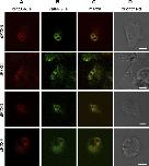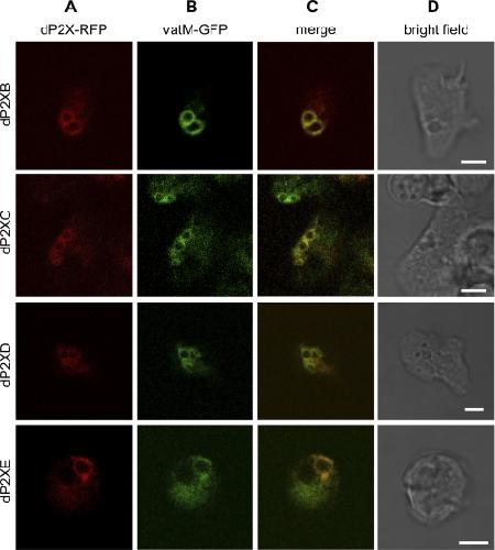 FIGURE 6. Intracellular localization of dP2XB–E receptors. Ax2 Dictyostelium co-transformed with RFP-tagged dP2XB–E receptors and eGFP-tagged vatM (14) were visualized by confocal microscopy. RFP-tagged dP2XB–E receptors localized to membranes of an intracellular organelle (Column A) with no detectable expression on the plasma membrane. eGFP-tagged vatM, which corresponds to the 100-kDa subunit of the contractile vacuole vH+ATPase (14) localized to the same intracellular membranes as RFP-tagged dP2X receptors (Columns B and C), showing that dP2X receptors are enriched on the membranes of the contractile vacuole. Scale bars, 5 μm.