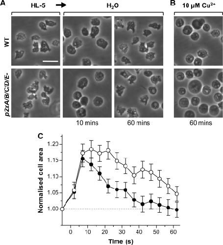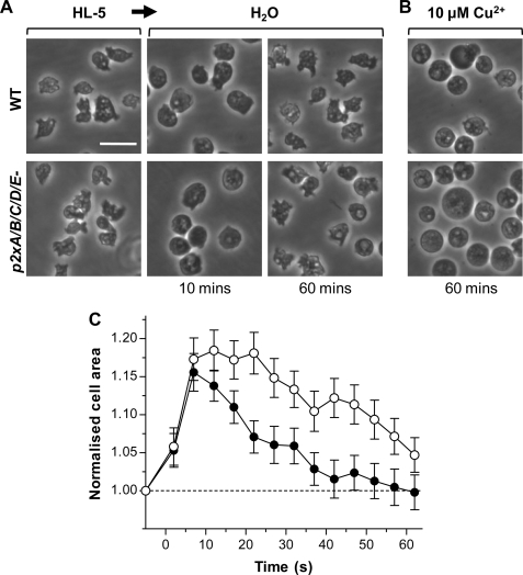 FIGURE 8. dP2X receptors are not essential for osmoregulation. A, differential interference contrast images of wild-type (top panel) and quintuple p2x null (bottom panel) cells in HL5 media and distilled water at 10 and 60 min. Both wild-type and mutant cells swell within the first 10 min and recover after 60 min. B, in the presence of 10 μm copper both wild-type and quintuple p2x null cells remain swollen after 60 min. Scale bar, 20 μm. C, time course of cell swelling and recovery in wild type (black circles) and quintuple p2x null (white circles) cells in distilled water. p2x null cells remain swollen slightly longer than wild type but are still able to recover. Data are presented as means of four independent experiments for wild type and six independent experiments with two independent clones (three experiments for each clone) for p2x null cells (n = 80–240 cells for each data point).