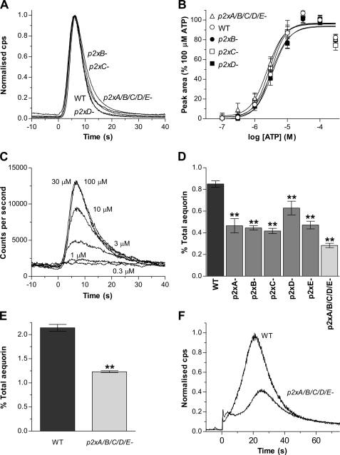 FIGURE 5. The response to extracellular purine nucleotides persist in p2x null strains. A, representative aequorin responses to ATP (30 μm) in p2xB, p2xC, and p2xD single and p2xA/B/C/D/E quintuple null strains compared with wild type (WT). Cells were incubated with the cofactor benzyl-coelenterazine in HL-5 media (1 × 107 cells/ml) to reconstitute functional aequorin and then transferred to MES development buffer (10 mm MES, 10 mm KCl, 0.25 mm CaCl2 pH 6.8) (5 × 106 cells/ml), and responses to ATP were monitored using a luminometer. The kinetics of the response to ATP is unaffected by p2x gene deletion. Traces are normalized to the maximal response for each individual strain to provide a direct comparison of time course. Time 0 corresponds to the application of agonist. B, ATP concentration response curves for WT and p2x null strains. Data are normalized to 100 μm ATP for each strain (mean ± S.E., n ≥ 5 for each data point from at least two independent experiments). C, representative concentration-dependent ATP responses in p2xA/B/C/D/E quintuple null cells. D, response magnitudes to ATP (30 μm) expressed as percent total aequorin consumption for wild-type (WT) and p2x null strains. Data are presented as means ± S.E. from 18 independent experiments for wild-type and six independent experiments with two independent clones for p2x null strains (n ≥ 30). E, the magnitude of the response to calmidazolium (2.5 μm) is reduced in p2xA/B/C/D/E quintuple null cells compared with wild type (WT). Data are presented as mean percent total aequorin consumption from four independent experiments with two independent clones assayed for p2xA/B/C/D/E null cells (n ≥ 20). F, representative aequorin responses to calmidazolium (2.5 μm) in wild-type and p2xA/B/C/D/E null cells. **, significant difference (p < 0.01) compared with wild type.