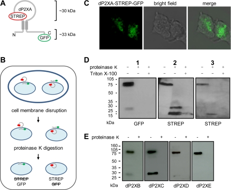 FIGURE 7. Orientation of dP2X proteins in contractile vacuole membranes. A, schematic of the dual-tagged dP2XA construct. Predicted sizes of fragments protected from proteinase K digestion are ∼30 kDa for the inter-transmembrane loop region and ∼33 kDa for the GFP-tagged C-terminal domain. B, overview of the protease protection assay. Cells were disrupted by passage through a 5-μm pore membrane so as to keep intracellular organelles intact prior to exposure to proteinase K (100 μg/ml). The inability of this enzyme to cross the membrane of intact organelles allows a distinction to be made between protein elements that reside in the cytosol (exposed proteinase K) and those that reside within the vacuole lumen (protected from proteinase K). The left side of the diagram depicts the scenario if the orientation was such that the inter-transmembrane domain is exposed to the cytosol (the STREP tag would be digested while the GFP tag would remain intact). The right side depicts the converse where the inter-transmembrane domain resides inside the vacuole lumen resulting in digestion of the GFP tag while STREP remains intact. C, representative confocal image of the dual-tagged dP2XA protein in vegetative cells confirming that contractile vacuole localization has not been disrupted by insertion of epitope tags. Scale bar is 5 μm. D, Western blot analysis of dual-tagged dP2XA incubated in the presence and absence of proteinase K. Both GFP and STREP epitopes are detectable in the full-length undigested receptor. However, after proteinase K digestion only the STREP epitope remains intact. A short pre-treatment with 1% Triton X-100, to disrupt vacuole membranes, permitted proteinase K access to the lumen and digestion of the STREP tag. An additional band containing the STREP epitope smaller than the expected ∼30 kDa was also detected (gels 2 and 3). This band was often the most prominent of the two digestion products observed and in samples where a higher proteinase K:protein ratio was used represented the only band detected (gel 3). E, loss of the GFP epitope following proteinase K digestion of intact vacuoles containing dP2XB–eGFP confirms an equivalent orientation for all five receptors. In some undigested samples the GFP antibody also detected a lower molecular weight protein of unknown origin (prominent in dP2XC example gel and also visible in dP2XB gel and gel 1).