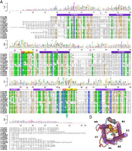 Figure 1. Amino acid sequence alignment of zebrafish aquaporins. (A) The consensus sequence logo is scaled according to amino acid conservation. Highest residue similarity (blue: 100%, green: 80-100% or sand; 60-80%) is found within the α-helical regions (H1-8). The transmembrane domains (TMD1-6) are annotated for DrAqp0a based upon a molecular sequence wrap to the crystallographically resolved structure of Bos taurus AQP0 (B). The structure wrap consists of the complete peptides (263 amino acids) with a gapless identity/similarity of 70.3/85.9%. The render shows identical residues in red, non-identical in blue. The hemi-helices H3 and H7 (yellow) on loops B and E, respectively, fold such that the opposing NPA motifs (pink in the alignment) interact to present the arginine constriction (DrAqp0a R187 green ball and stick, and arrow in alignment). The C-terminal domain is shown with a grey α-helix.