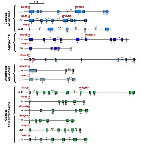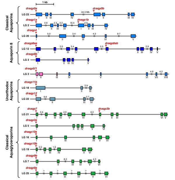 Figure 3. Genomic organization of zebrafish aquaporins. Schematic representation of zebrafish aquaporin gene structures and chromosomal loci. The boxes indicate exons with coding regions only. Distances are in kb or in Mb when indicated. In the case of draqp9a, the quality of the genomic sequence available was insufficient to establish the size of the introns.