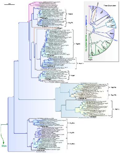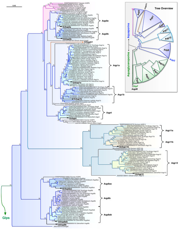 Figure 4. Bayesian majority rule consensus tree for the codon alignment of piscine and human aquaporins. The upper right panel shows the summarized topology of the complete tree rooted with archaean aqpm. The left panel shows the topology of the classical aquaporins (aqp0, -1, and -4), unorthodox aquaporins (aqp11 and -12) and Aqp8. Accession numbers are annotated with the taxa. Bayesian posterior probabilities are shown at each node. Scale bar indicates the rate of expected nucleotide substitutions per site.