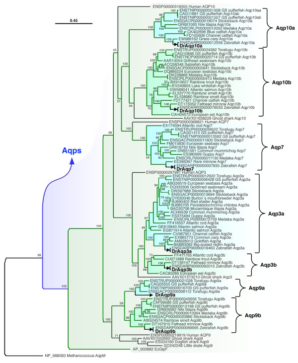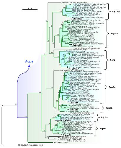 CONCLUSION: The zebrafish genome encodes the largest repertoire of functional vertebrate aquaporins with dual paralogy to human isoforms. Our data reveal an early and specific diversification of these integral membrane proteins at the root of the crown-clade of Teleostei. Despite the increase in gene copy number, zebrafish aquaporins mostly retain the substrate specificity characteristic of the tetrapod counterparts. Based upon the integration of phylogenetic, genomic and functional data we propose a new classification for the piscine aquaporin superfamily.