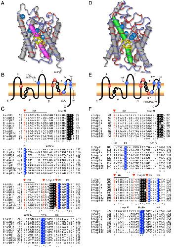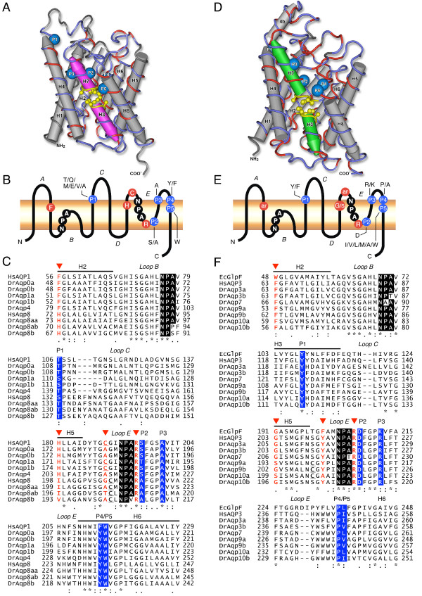 Figure 6. Structural features of zebrafish aquaporins. (A-C) Water-selective aquaporins and aquaglyceroporins (Glps; D-F). (A and D) Three-dimensional reconstruction of DrAqp4 wrapped to the crystallographically resolved structure of Escherichia coli AqpZ (1RC2 chain B), and DrAqp3a wrapped to the crystallographically resolved structure of E. coli GlpF (1LDI chain A). Molecules are mirror tube-worm renders rotated to show identical (red) and non-identical (blue) residues and the annotated features including the blue space-filled conserved sites (P1-P5) and the opposing yellow ball and stick Asn-Pro-Ala (NPA) motifs between hemi-helices H3 and H7. Despite low primary identity/similarity (21.1/36.6% for DrAqp4; 34.1/53.0% for DrAqp3a) the secondary and tertiary structures appear conserved. (B and E) Schematic diagram of aquaporin monomers showing the 6 transmembrane helices (H), the two NPA motifs, the amino acids forming the aromatic/arginine (ar/R) constriction, and the five residues (P1-P5) conserved in water-selective (B) and Glps (E). In each position the conserved residues are indicated. (C) Amino acid sequence alignment of human AQP1 and AQP8 (HsAQP1 and HsAQP8), mouse AQP8 (MmAQP8), DrAqp0a, -0b, -1a, -1b, -4, and zebrafish AQP8-related sequences (DrAqp8aa, -8ab and -8b). The arrowheads point to the positions of the ar/R constriction. The P1-P5 conserved amino acids are shaded in blue. The asterisks indicate identical residues, whereas conserved amino acid substitutions and substitutions with similar amino acids are indicated by a double or single dot, respectively. The potential mercury-sensitive Cys site before the second NPA motif is underlined. (F) Amino acid sequence alignment of EcGlpF, human AQP3 (HsAQP3) and zebrafish Glps. Symbols and notes as in C.