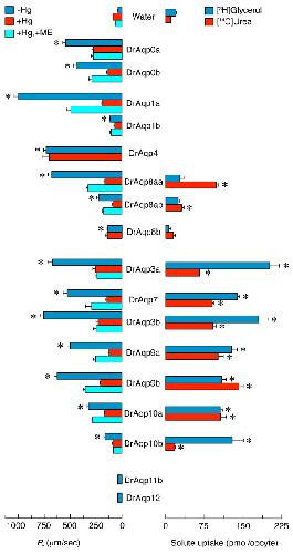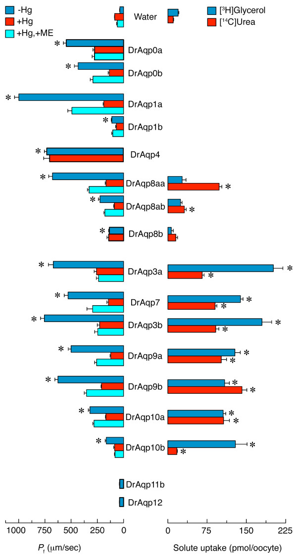 Figure 7. Functional characterization of zebrafish aquaporins. Osmotic water permeability (Pf; left), and glycerol and urea uptake (right), of Xenopus laevis oocytes expressing zebrafish aquaporins. The Pf was assayed in the presence or absence of HgCl2 and β-mercaptoethanol (ME). Values (mean ± SEM; n = 8-10 oocytes) with an asterisk are significantly (p < 0.01) different from water-injected oocytes in a representative experiment.