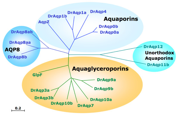 Figure 2. Phylogenetic relationships among zebrafish aquaporins. The unrooted phylogenetic tree was constructed using the NJ method. The Escherichia coli homologs (EcAqpZ and EcGlpF) cluster as aquaporins and aquaglyceroporins, respectively. The bar indicates the mean distance of 0.2 changes per amino acid residue.