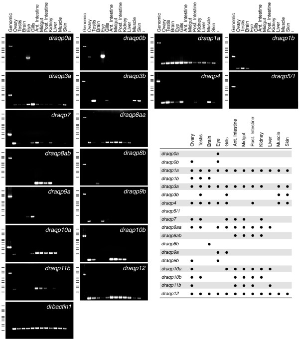 Figure 8. Aquaporin gene expression in adult tissues of zebrafish. Representative RT-PCR analysis of aquaporin and b-actin1 (drbactin1) transcripts. PCR on genomic DNA was used as control. Minus indicates absence of RT during cDNA synthesis. The size (kb) of PCR products and molecular markers are indicated on the left; from top to bottom: 21.23, 5.15, 4.27, 3.53, 2.03, 1.91, 1.58, 1.37, 0.95, 0.83 and 0.56. A summary of the presence or absence of the aquaporin transcripts in the different tissues is shown to the lower right.