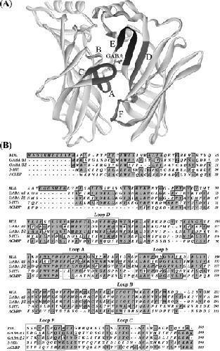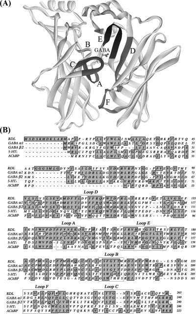 Figure 1. (A) RDL extracellular domain dimer. Extracellular loops A−F that form the agonist binding site region in related Cys-loop receptors are labeled. (B) Sequence alignment of extracellular domains of RDL and homologous Cys-loop receptor subunits (human GABAA α1, human GABAA β2, mouse 5-HT3A, and AChBP).