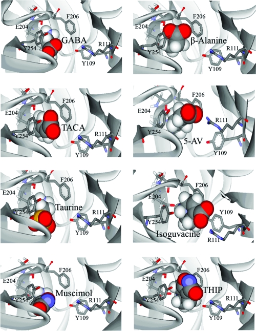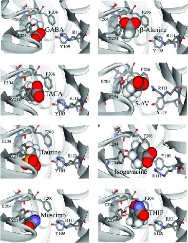 Figure 4. Docking of GABA and active analogues (β-alanine, TACA, 5-AV, taurine, isoguvacine, muscimol, and THIP) into the RDL binding site. Analogues docked with the ammonium group located deep in the cleft formed between loop B and loop C aromatic residues. The carboxylate moiety or equivalent substituent was predicted to be located facing toward Arg111.