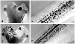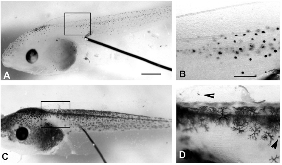 melanophores in the head region of the wild-type partner, indicating removal of the pituitary. (B) The tail region of the parabiotic animals near the site of fusion. Note the