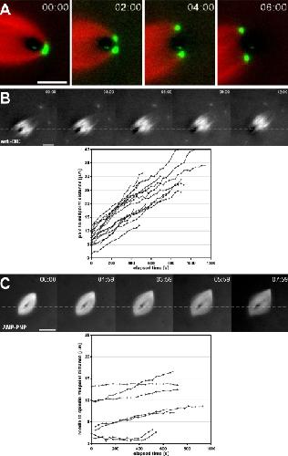 Figure 3. Intrinsic forces push but do not pull the spindle off impaling microneedles. (A) The time-lapse series shows the dynamic morphology of a spindle pole, labeled with Alexa Fluor 488 anti-NuMA antibodies (green), as it is split by a microneedle. Spindles continued to move despite a lack of any detectable microtubules (red) on the distal side of the microneedle. (B) Time-lapse images show the behavior of skewered spindles ∼5–10 min after the addition of function-perturbing antibodies against the 70.1-kD DIC (anti-DIC). The distance between the metaphase plate and the needle were measured and plotted as a function of time for multiple spindles in the corresponding graph. (C) Assembled spindles were treated with 1.5 µM AMP-PNP and skewered within 5–10 min after treatment. AMP-PNP at this concentration inhibited flux, in agreement with nearly horizontal plots of needle to spindle midpoint distance versus time (graph). (B and C) Dashed lines indicate the position of the microneedle used to skewer the spindles. Bars: (A) 5 µm; (B and C) 25 µm.