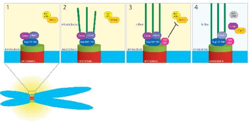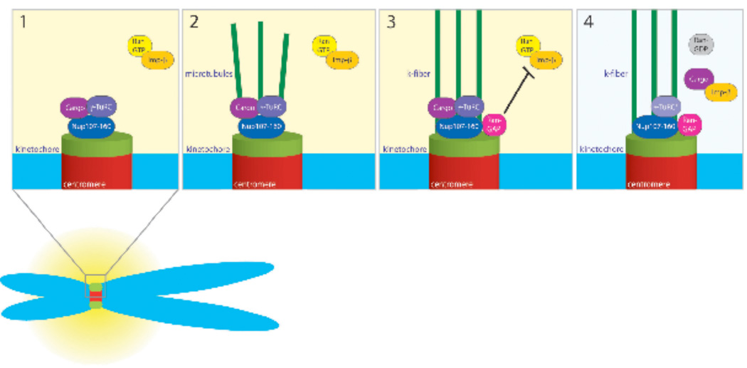 Figure 5. Model for Nup107-160 and γ-TuRC regulation at kinetochoresStep 1: Nup107-160 (dark blue) and active γ-TuRC (purple) bind to unattached kinetochores. We postulate that a transport cargo (plum) may be released in the high Ran-GTP environment that maintains γ-TuRC in an active state.Step 2: Nup107-160 and γ-TuRC nucleate MTs (green lines) at kinetochores, promoting the assembly of k-fibers.Step 3: RanGAP1 (magenta) is recruited along k-fibers. Its recruitment lowers Ran-GTP levels near kinetochores. The lower Ran-GTP levels in turn allow Importin-b or another import receptor to bind the cargo protein.Step 4: After the cargo molecule is sequestered, γ-TuRC becomes inactive (pale lilac), but k-fibers remain stable.