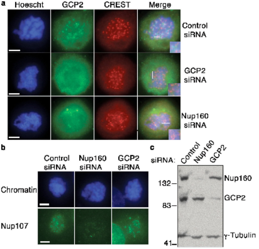Figure 2. γ-TuRC is recruited to kinetochores by Nup107-160(a) HeLa cells were depleted of GCP2 (second row) or Nup160 (third row) by siRNA. The cells were treated with nocodazole for 16 hrs and processed for indirect immunofluorescence with antibodies against GCP2 (second column, green) and kinetochore marker CREST serum (third column, red) and counterstained with Hoechst 33342 dye to visualize chromosomal DNA (left, blue). Inset shows enlarged, merged image of kinetochores. Top row shows HeLa cells transfected with a control siRNA, treated in an identical manner. Scale bar = 5 µm.(b) HeLa cells were treated as in (a), stained with antibodies against Nup107 (second row, green) and counterstained with Hoechst 33342 dye to visualize chromosomal DNA (top row, blue).(c) Whole cell extracts from control HeLa cells (left), cells depleted of Nup160 (center) or cells depleted of GCP2 (right) were analyzed by Western blotting with the indicated antibodies to monitor the overall level of depletion through siRNAs.