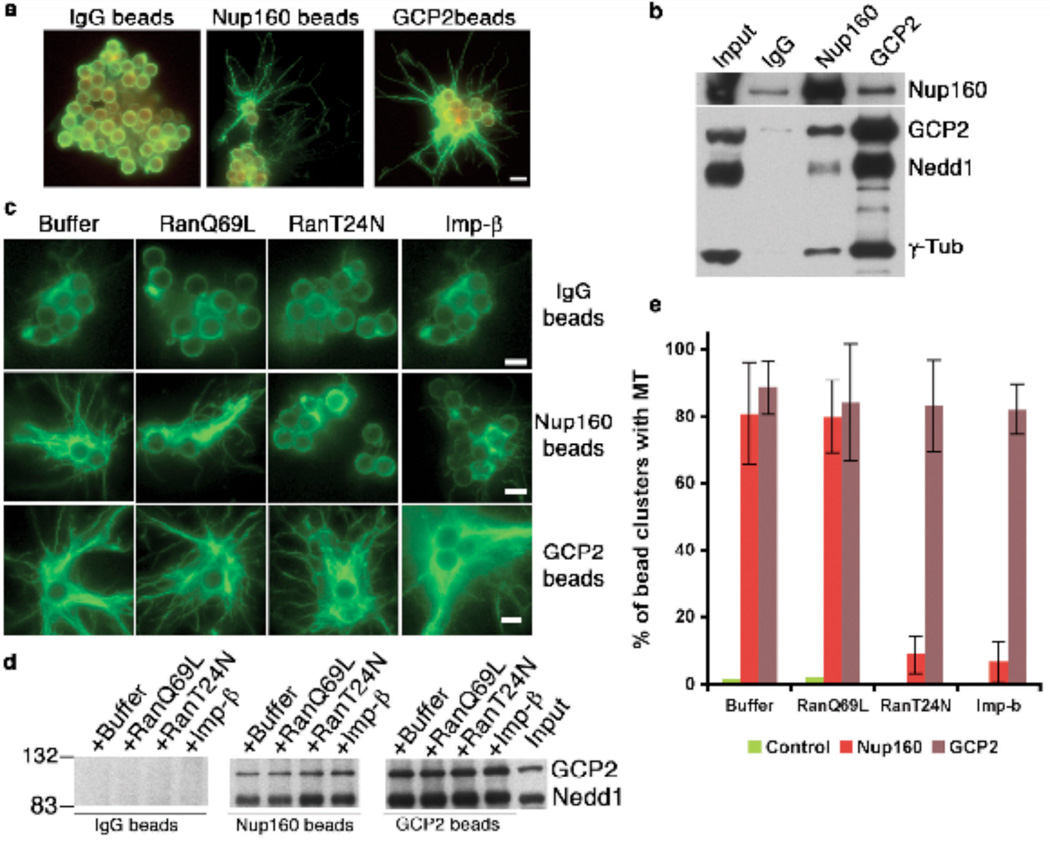 Figure 4. Ran-GTP regulates MT nucleation by xNup107-160 / γ-TuRC complexes(a) Magnetic beads coated with control IgG, anti-xNup160 or anti-xGCP2 antibodies were incubated in CSF XEEs for 90 minutes. The beads were re-isolated, washed and incubated with tubulin and GTP for 10 minutes. After fixation, the beads were pelleted onto coverslips and stained with antibodies against α-tubulin. Scale bar = 2.8 µm(b) Proteins associated with beads prepared as in (a) were eluted with low pH. Eluted fractions and untreated XEE (input) were analyzed by Western blotting for xNup160 and γ-TuRC components. Uncropped images of the blots are shown in Supplementary Information, Fig. S3.(c) Magnetic beads coated with control IgG, anti-xGCP2 or anti-xNup160 antibodies were incubated for 90 minutes in Control, Ran-T24N, Ran-Q69L or Importin-b-treated CSF XEEs. The beads were re-isolated, washed and incubated with tubulin and GTP for 10 minutes. After fixation, the beads were pelleted onto coverslips and stained with antibodies against α-tubulin. Scale bar = 2.8 µm(d) Proteins bound to beads as in (c) were eluted with low pH and analyzed along with untreated XEE (input) by western blotting for GCP2 and Nedd1 (γ-TuRC components). Uncropped images of the blots are shown in Supplementary Information, Fig. S3.(e) To quantitate the extent of MT nucleation, magnetic beads coated with control IgG, anti-xGCP2 or anti-xNup160 antibodies were in incubated in untreated, Ran-T24N-, Ran-Q69L or Importin-β-treated CSF XEEs, as in (c). In three independent experiments, we scored clusters containing three to six beads for associated MTs. The graph shows the mean percentage of clusters showing MTs in each case, +/− SD.