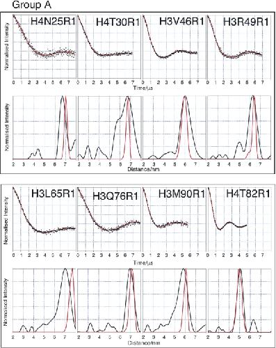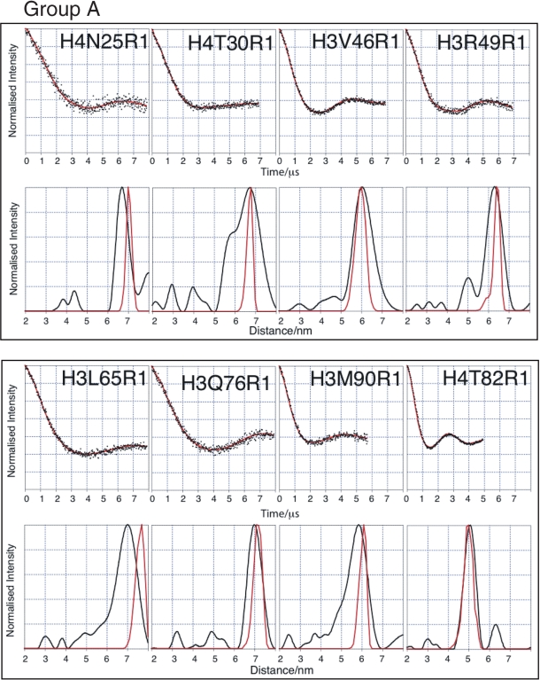 Figure 2. PELDOR data from the histone octamer for Group A. Results derived from label positions >4 nm apart based on predicted Cα-Cα distance. For each mutant two graphs of data are shown. Top graphs: Background corrected echo oscillations (black), Tikhonov fit (red). Bottom graphs: Tikhonov regularization-derived distance distributions (black), simulated distributions (red).