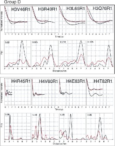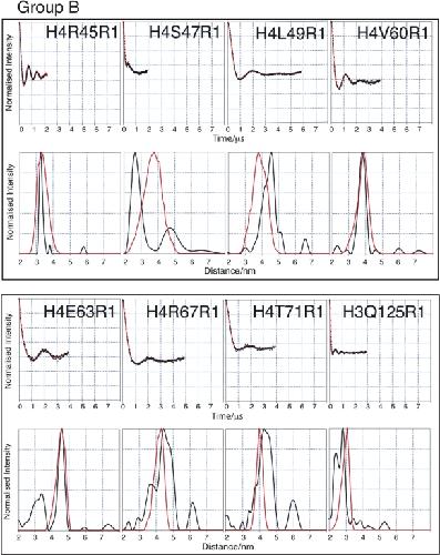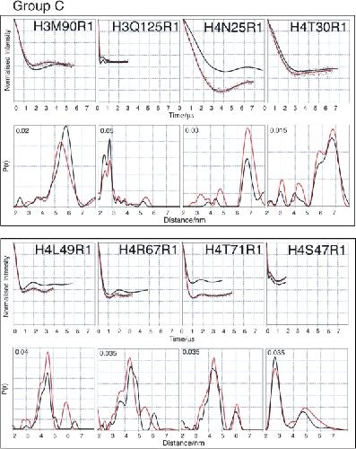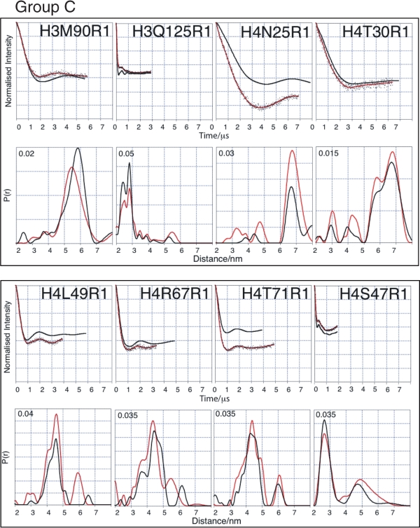 Figure 3. PELDOR data from the histone octamer for Group B. Results derived from label positions <4 nm apart based on predicted Cα-Cα distance. For each mutant two graphs of data are shown. Top graphs: Background corrected echo oscillations (black), Tikhonov fit (red). Bottom graphs: Tikhonov regularization-derived distance distributions (black), simulated distributions (red).