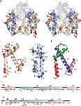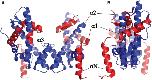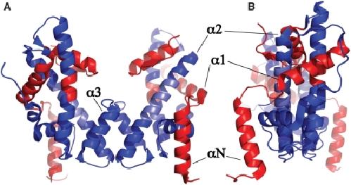 Figure 6. Cartoon view of H3/H4 histone tetramer coloured as per histone core octamer structure. Very similar regions (blue), very dissimilar or heterogeneous regions (red), region with lack of reporting data (light blue) are depicted. The helices of histone H3 are labelled for clarity. (A) front view showing H3-H3′ interface at centre. (B) side view.