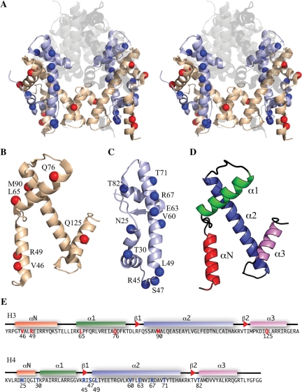 Figure 1. Known structure and spin labelling positions. (A) Stereo cartoon from the crystal structure (1.9 Å) of the histone octamer (PDB code 1TZY): H2A, H2B represented by transparent/grey colour; H3 by wheat; H4 by pale blue. Spin label positions indicated by blue (H4) or red (H3) spheres. (B) H3 labelling positions (red) on monomer. (C) H4-labelling positions (blue) monomer. (D) Histone fold (colour coded). (E) H3 and H4 amino acid sequences with labelling sites coloured red and blue, respectively. Helices indicated by coloured boxes and β-sheets by red arrowheads.