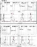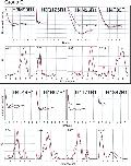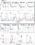 Figure 4. Comparison of tetramer and octamer PELDOR data in Group C (minor differences between octamer and tetramer measurements). For each mutant two graphs of data are shown. Top graphs: Tikhonov-derived fit to octamer PELDOR data (black), background-corrected echo oscillation from tetramer (black dots) and Tikhonov-derived fit to tetramer (red). Bottom graphs: Tikhonov regularization-derived distance distributions octamer (black), tetramer (red).