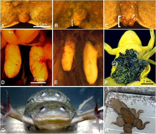 Fig. 1. Atrazine feminized exposed males. Cloaca (AâC) and gonads (DâF) for control male (A and D), atrazine-exposed male (B and E), and atrazine-exposed female (C and F) ZZ animals (genetic males). (G) Atrazine-induced female (genetic male, ZZ) copulating with an unexposed male sibling. (H) Same pair as in G, producing eggs. Eggs (H) were viable and produced larvae that survived to metamorphosis and adulthood. Yellow coloration (F) is the result of fixation in Bouinâs solution. Brackets (B and C) indicate protruding cloacal labia. (Scale bar in A applies to AâC; in D applies to D and E.)