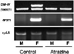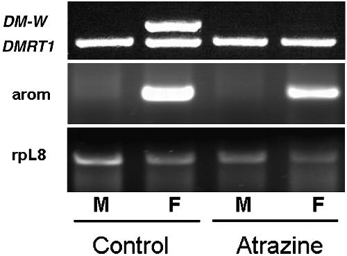 Fig. 2. Atrazine-induced females expressed aromatase in their gonads. (Top) DMRT-1 and DM-W genes from a representative control and an atrazine-exposed adult male (M) and female (F). Morphologic sex was assigned on the basis of the presence of testes (males) or ovaries (females). (Middle and Bottom) Cyp-19 aromatase expression from gonads of the same animals genotyped at Top, along with the control gene, rpL8.
