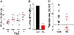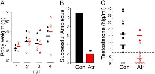 Fig. 4. Control males out-competed atrazine-exposed males to copulate with females. Amplexus data from four mate choice trials for control (Con) and atrazine-treated (Atr) males (A). Eleven of 16 control males out-competed atrazine-exposed males for amplexus with females. Only two atrazine-exposed males in a single trial achieved amplexus. Male size did not affect breeding success (B). In all four trials, there was no difference (P > 0.05) in size between control (black symbols and bars) and atrazine-exposed males (red symbols and bars). Furthermore, in all trials smaller individuals from controls out-competed larger atrazine-exposed individuals. Filled circles show successful males, open circles show unsuccessful males, and horizontal bars show group means. (C) Testosterone levels for control and atrazine-treated males for all four trials. Filled symbols show successful (amplectant) males, and open symbols show unsuccessful males. Solid horizontal bars show mean testosterone levels for successful males, and open bars show the mean for unsuccessful males.