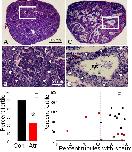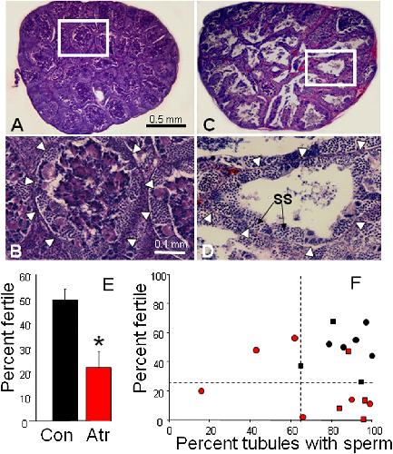 Fig. 5. Atrazine decreased androgen-dependent sperm production, mating behavior, and fertility. (A and C) Largest testicular cross-sections for representative control (A) and atrazine-exposed males (C) from 2007. (B and D) Magnification of individual tubules for control (B) and atrazine-exposed (D) males. Arrowheads in B and D show outline of tubules. Control tubules are typically filled with mature spermatozoa bundles, whereas the majority of tubules in atrazine-exposed males lack mature sperm bundles and are nearly empty, with only secondary spermatocytes (SS) along the periphery of the tubule. (E) Fertility for control (Con) and atrazine-exposed (Atr) males. Pooled data from both 2007 and 2008 study are shown. *P < 0.005 (ANOVA). (F) Fertility plotted against sperm content (percentage of tubules with mature sperm bundles) for control males (black symbols) and atrazine-exposed males (red symbols) for the 2007 (circles) and the 2008 (squares) studies. Dashed lines indicate the lower limit for controls for fertility and sperm content. Sample size differs from the number of trials because no data are available from females that did not lay eggs. (Bar in A applies to A and C; in B applies to B and D.)