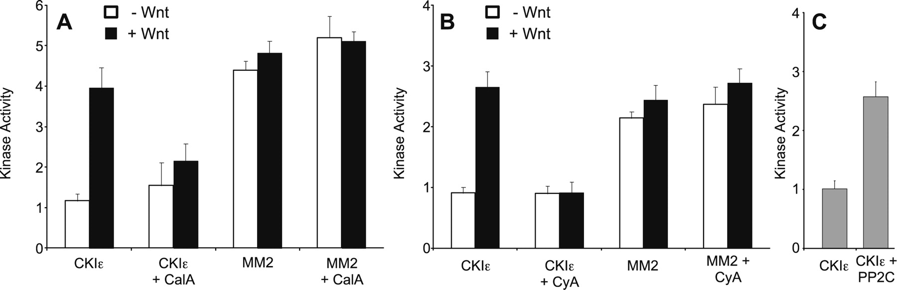 FIG. 6. Inhibition of serine/threonine phosphatases blocks CKI activation by Wnt signaling. A and B, calyculin A and cyclosporine A