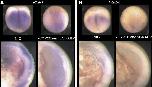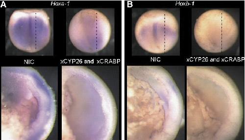 Fig. 6. Effects of targeted retinoid signalling removal in the mesoderm. Whole-mount in situ hybridizations on Xenopus laevis embryos. Hoxa-1 (A) and Hoxb-1 (B) expression at st. 13. NIC: non-injected controls. xCYP26 and xCRABP: Injection of 100 pg xCYP26: 100 pg xCRABP mRNA four times, one time into each macromere at 8-cells stage. Whole embryos (top picture) are shown in a dorsal view with anterior being up. Cut embryos (bottom picture) are shown in a lateral view.