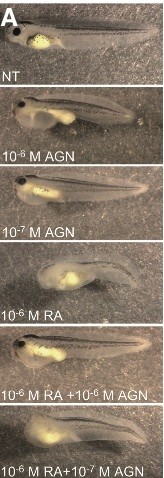 Fig. 1. AGN193109 efficiently depletes retinoid signalling in vivo. (A) The RAR antagonist AGN193109 rescues the RA phenotype. Xenopus laevis embryos incubated in 10-6 M RA show anterior truncations. Embryos incubated in 10-6 M and 10-7 M AGN show a shorter hindbrain area and a large heart oedema with the phenotype being more severe at 10-6 M. When embryos are incubated in equal concentrations (10-6 M) of RA and AGN the resulting phenotype is more like the AGN phenotype. When 10-6 M RA is combined with 10-7 M AGN the phenotype is more like an RA phenotype. NT (control).