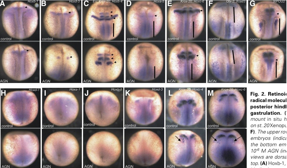 Fig. 2. Retinoid depletion causes radical molecular truncation of the posteriorhindbrain by the end of gastrulation. (Top panel) Whole- mount in situ hybridizations (wISH) on st. 20 Xenopus laevis embryos (A- F). The upper row shows non-treated embryos (indicated by control) and the bottom embryo is treated with 10-6 M AGN (indicated by AGN). All views are dorsal and anterior at the top. (A) Hoxb-1, arrowhead indicates hindbrain expression; (B) Hoxd-3, ar-