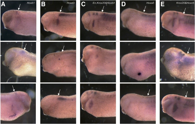 Fig. 3. The molecular identity of the hindbrain is determined by retinoid signalling mostly during gastrulation. Whole-mount in situ hybridizations on tadpole (st. 32) Xenopus laevis embryos. The upper row shows non-treated embryos; the middle row embryos treated with 10-6 M AGN from the blastula until the point of fixation; the lowest row embryos treated with 10-6 M AGN from st. 13 until the point of fixation. All views are lateral. (A) Hoxb-1, (B) Hoxd-3, (C) En2, Krox-20 and Hoxb-4, (D) Hoxa-5, (E) Krox-20 and Hoxc- 6. Arrows point to the anterior expression border of each Hox gene.