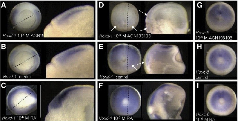 Fig. 4. AGN incubation affects early expression of Hoxd-1 in the neuro- ectoderm but not in the underly- ing mesoderm. Whole-mount in situ hybridizations on Xenopus laevis em- bryos. Hoxd-1 expression at st. 11 A-C) or st. 12.5 (D-F). Embryos were ncubated with 10-6 M AGN (A,D), 10-6 M RA (C,F) or not treated (0.1% DMSO) (B,E). After photographing the em- bryos were cut along the indicated dashed line and a lateral view of the cut surface is shown next to the right of each embryo. Arrows in (D,E) point to the faint mesodermal expression remaining at that stage (mostly non- involuted mesoderm). Hoxc-6 expres- sion on stage 12 embryos (G-I). Treat- ment with 10-6 M AGN (G), 10-6 M RA (I) or not treated (H).