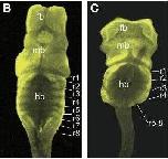 Fig. 1. AGN193109 efficiently depletes retin- oid signalling in vivo.(B) AGN treatment caused severe brain malformations. CLSM images of stage 45 tadpole brains labelled with Xen1 and 2G9 antibodies. (B) Control embryo, treated with 0.1% DMSO. (C) 10-6 M AGN treated embryos (fb: forebrain; mb: midbrain; hb: hindbrain, rn refer to rhombomere numbers). In AGN treated embryos, the number of rhombomeres was reduced to 4 or 5.