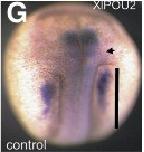 pou3f4 (POU class 3 homeobox 4) gene expression in Xenopus laevis embryos, NF stage 20, assayed by in situ hybridization. dorsal view, anterior up.