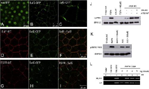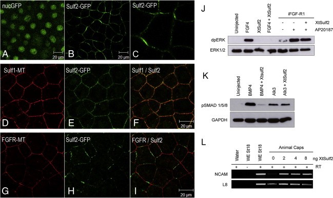 Fig. 2. Localisation and activity of XtSulf2. RNAs coding for tagged proteins were injected into the animal hemisphere of both blastomeres of a two-cell X. laevis embryo and processed for immunohistochemistry at NF stage 10. (A) Embryos injected with 1Â ng of Nuc-GFP. (B and C) Embryos injected with 2Â ng of XtSulf2âGFP. (DâF) Embryos co-injected with RNA coding for XtSulf1-Myc (D) and XtSulf2âGFP. (E) The yellow regions in (F) show where XtSulf1 and XtSulf2 expression overlap. Embryos were co-injected with mRNA coding for FGFR1-Myc (G) and XtSulf2âGFP (H) proteins. While both proteins appear associated with the membrane, they do not completely overlap (I). Western analysis shows in (J) that XtSulf2 while injection of mRNA coding for XtSulf2 inhibits activation of dpERK by FGF4 protein, it has no effect on dpERK activation by the intracellularly drug induced iFGFR1. (K) BMP4 activity was assayed by Western blot analysis using antibodies against phospho-SMAD 1/5/8. The phosphorylation of SMAD 1/5/8 stimulated in animal caps by injection of mRNA coding for BMP4 is down-regulated in animal caps co-expressing XtSulf2. However, animal caps expressing a constitutively active BMP4 receptor, Alk3 continue to express phospho-SMAD 1/5/8 in the presence of XtSulf2, indicating that XtSulf2 acts upstream of the BMP4 receptor. (L) Neuralisation of animal caps was assayed using RT-PCR to detect NCAM expression. Whole embryos (WE) express NCAM at NF stage 18, while control animal caps do not. Injection of mRNA coding for XtSulf2 results in the activation of NCAM expression. Samples with water and without AMV Reverse Transcriptase (RT) were used as negative controls; L8 was used as a loading control.