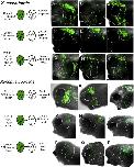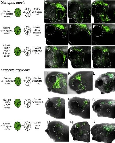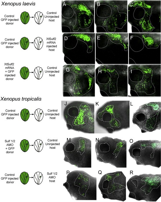 Fig. 8. Grafting experiments reveal a requirement for XtSulf1/2 in the environment through which cranial neural crest cells migrate. On the left, cartoons depict the design of the neural crest grafting experiments, while the panels to the right show the resulting embryos at tailbud stages. The top set of experiments show X. laevis embryos injected at the two-cell stage with 0.5 ng of GFP mRNA, ± 3 ng of mRNA coding for XtSulf2 and from which are dissected CNC explants at NF stage 14. Explants are transplanted into either a control embryo or an embryo injected with 3 ng of XtSulf2 mRNA. (AâC) Control host embryos transplanted at NF stage 14 with GFP expressing neural crest explants. (DâF) Host embryos injected with 3 ng of XtSulf2 at the two-cell stage into the animal pole and grafted with GFP expressing CNC explants at NF stage 14. (GâI) Control X. laevis host embryos grafted at NF stage 14 with GFP + XtSulf2 expressing CNC explants. All pictures were taken at 10X magnification; the eye, cement gland, and labelled cells are outlined. The bottom set of experiment show X. tropicalis embryos injected with mRNA coding for GFP ± AMOs targeted against XtSulf1 and XtSulf2. (JâL) At NF stage 15, CNC explants were taken from control Xenopus tropicalis embryos expressing GFP and transplanted into uninjected control embryos at the same stage. The GFP labelled cells migrate into the branchial arches by NF stage 30. (MâO) GFP mRNA together with AMOs targeting both XtSulf1 and XtSulf2 were injected into the animal hemisphere at the 2-cell stage and at NF stage 15 CNC explants were transplanted into control host embryos at the same stage. Labelled S1/S2 knockdown cells migrate less extensively than the control cells, but have direction. (PâR) At NF stage 15, CNC explants were taken from control Xenopus tropicalis embryos expressing GFP and transplanted into host embryos in which XtSulf1 and XtSulf2 have been knocked down. At stage 30, labelled cells are seen to be widely dispersed, suggesting that these wildtype cells lack direction in the S1/S2 mutant background. The eye, cement gland, and labelled cells are outlined.