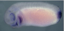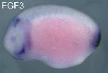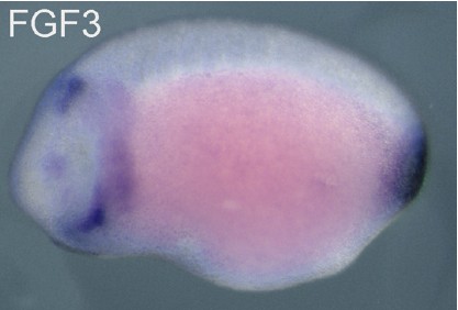 fgf3 (fibroblast growth factor 3) gene expression in Xenopus tropicalis embryo, assayed via in situ hybridization, NF stage 26, lateral view, anterior left, dorsal up.