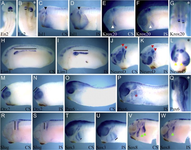 Fig. 3. Overexpression of XtSulf2 affects the expression of a number of genes expressed in anterior neural tissue and the cranial neural crest. One blastomere of a two-cell Xenopus tropicalis embryo was injected with 0.5Â ng of XtSulf2 mRNA, embryos were allowed to develop to NF stage 28 and fixed for in situ hybridization using En2 (AâB), Isl1 (CâD), Krox20 (EâG), Lim1 (HâI), NeuroD (JâL), Otx2 (MâN), Pax6 (OâQ), Slug (RâS), Sox3 (TâU), and Sox8 (VâW). En2 expression is shifted posteriorly on the injected side (AâB). Isl1 expression in the profundal and trigeminal placodes shifts posteriorly (black arrowheads) as does the expression in the heart (CâD). Krox20 expression in the migrating neural crest shifts posteriorly (EâF white arrowheads) as does the expression in r5 (G black lines). Lim1 expression in the pronephros is restricted anteriorly (HâI black lines). NeuroD expression in the profundal and trigeminal placodes is disrupted (JâK red arrowheads), and expression in the olfactory placodes fuses with expression in the eye placodes (L yellow arrowheads). Otx2 expression is restricted in the midbrain (MâN black lines). Pax6 expression is ectopically expressed in the posterior and dorsal head ectoderm (OâPâQ red asterisk). Slug expression at the leading edge of neural crest migration remains closer to the neural tube than in controls (RâS black lines). Sox3 expression is decreased in neural crest but expands laterally (TâU black lines). Sox8 expression in the anterior and posterior branchial arches is decreased and the leading edge of the migrating neural crest remains closer to the neural tube than in controls (VâW green arrowhead). (AâB, G, Q) are dorsal views of embryos, anterior at the top. (CâF, HâK, MâP, RâW) are lateral views of embryos, anterior to the left. (L) is an anterior view of embryo in (JâK), dorsal at the top. Asterisks indicate injected side. CS control side, IS injected side.