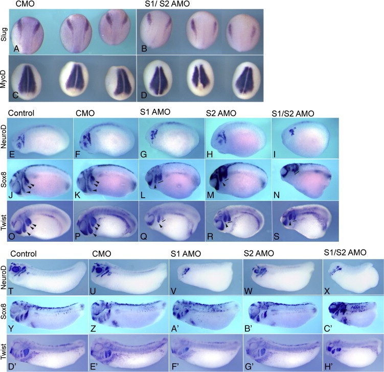 Fig. 5. XtSulf1/2 double knockdown embryos show impaired early migration of the cranial neural crest. Xenopus tropicalis embryos were injected at two and four-cell stage into the animal hemisphere. Sibling embryos were cultured until NF stage 15 (top panels), stage 22 (middle panels) and NF stage 30 (bottom panels) and fixed for in situ hybridisation. This figure shows control uninjected embryos (E, J, O, T, Y, Dâ²); embryos injected with 30Â ng of control morpholino oligo (CMO) (A, C, F, K, P, U, Z, Eâ²); embryos injected with 10Â ng of antisense morpholino oligo (AMO) targeted against XtSulf1 (G, L, Q, V, Aâ², Fâ²); embryos injected with 20Â ng of AMO targeted against XtSulf2 (H, M, R, W, Bâ², Gâ²); and embryos co-injected with 10Â ng of AMO targeted against XtSulf1and 20Â ng of AMO targeted against XtSulf1(B, D, I, N, S, X, Câ², Hâ²). Top panels (AâD) are dorsal views, the others are lateral views with anterior to the left. At stage 15, the expression of Slug marks the prospective neural crest at the boundary of the neural plate and the non-neural ectoderm (A, B). MyoD marks the dorsal, paraxial mesoderm (C, D). The expression of these genes is not effected when embryos are injected into the animal hemisphere with AMOs targeting XtSulf1 and XtSulf2 (B, D). At stage 22, NeuroD is expressed in the profundal, trigeminal and antero-dorsal lateral line placodes and lens (E,F). In single XtSulf1 knockdown, NeuroD expression in these placodes is reduced and disorganised (G), while in double Sulf knockdown, NeuroD expression is further reduced and restricted to a very small dorsal region (L). Sox8 and Twist are expressed in the mandibular (around the eye), hyoid and branchial arches (J, K, O, P; three arrow heads) at NF stage 22. In single XtSulf1 and XtSulf2 knockdown embryos the expression of these markers in the mandibular arch appears normal, but the expression in the hyoid and branchial arches does not extend as far ventrally as controls (L, M, R, Q; arrowhead and line). The anterior and posterior branchial arches are no longer visible as two distinct entities. In double Sulf1/2 knockdowns, Sox8 and Twist expression in the mandibular arch is normal, but expression in the hyoid and branchial arches is further restricted dorsally and the anterior and posterior branchial arches appear as one fused domain (N and S, arrowhead and line). At NF stage 30, NeuroD is expressed normally in the neural placodes and pineal gland (T,U). In XtSulf1 single knockout, expression in the antero-dorsal lateral line and trigeminal placodes migrate abnormally, all other expression is absent (V). In XtSulf2 knockouts, NeuroD expression is absent from the posterior lateral line placode, and expression in the trigeminal and antero-dorsal lateral line placode appear closer together (W). In double Sulf knockouts, NeuroD is expressed abnormally in the antero-dorsal lateral line and trigeminal placodes (X). Sox8 and Twist are expressed in the mandibular, hyoid and branchial arches (Y, Z, Dâ², Eâ²). In single knockouts, the expression in the mandibular arch appears normal, but the expression in the hyoid and branchial arches is restricted dorsally. Furthermore, the anterior and posterior branchial arches appear fused together (Aâ², Bâ², Fâ², Gâ²). In double Sulf knockouts, Sox8 and Twist expression domains are restricted dorsally in the hyoid and branchial arches, and the expression is fused in the anterior and posterior branchial arches (Câ², Hâ²). The effects of XtSulf 1/2 knockdown on CNC migration as assayed by the expression of the markers shown in this figure are summarised in Table 1.