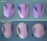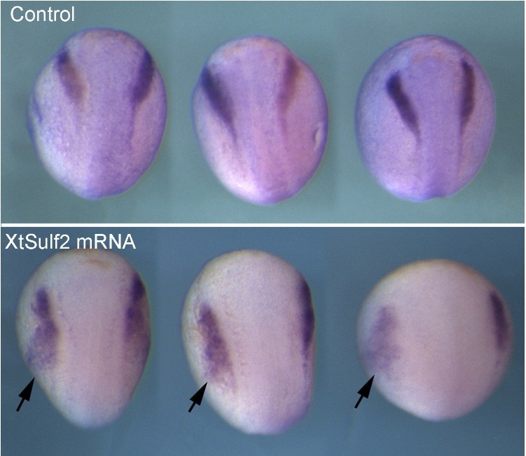 Control embryos (top panel) show the normal expression of Slug at neural plate stage 15. Embryos overexpressing XtSulf2 show reduced Slug expression in some embryos (13/24) and in some of these there is a loss of a sharp lateral boundary (arrows) of Slug expression when XtSulf2 is overexpressed. However there is no loss of MyoD expression (not shown) in these embryos as injections were done into the animal hemisphere.